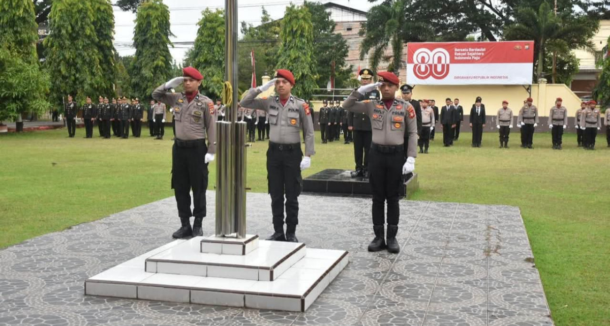 Suasana sakral terasa ketika tiga personel Satuan Reskrim dengan langkah mantap mengibarkan Sang Saka Merah Putih. Detik-detik pengibaran bendera yang diiringi lagu kebangsaan Indonesia Raya membuat seluruh peserta larut dalam rasa haru dan kebanggaan.