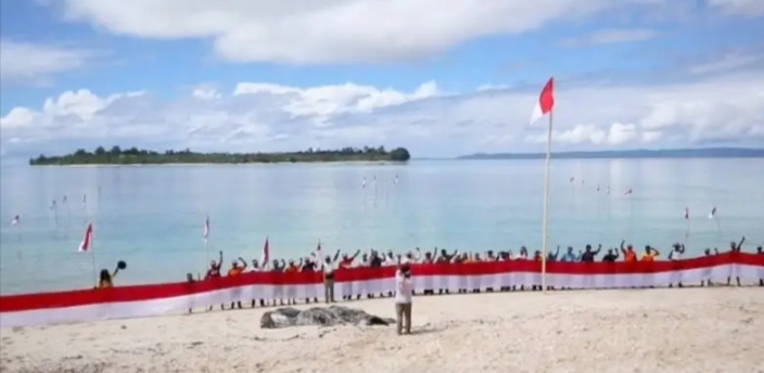 Sebagai simbol perlawanan, peserta membentangkan Bendera Merah Putih sepanjang 80 meter di bibir pantai. Warna merah-putih itu bergelombang seirama dengan laut, seakan mengingatkan: kedaulatan bukan hanya soal menjaga batas negara, tapi juga melindungi rakyat adat dari ketamakan yang merampas hidup mereka.