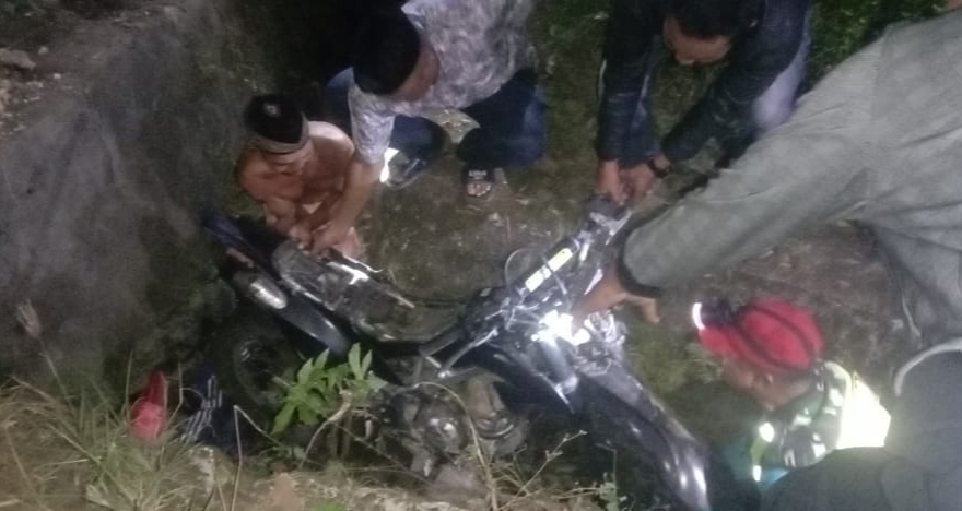 Sebuah sepeda motor jenis KLX yang dikendarai Arifin, berboncengan dengan Harfin, mereka terperosok ke dalam parit setelah diduga kehilangan kendali.