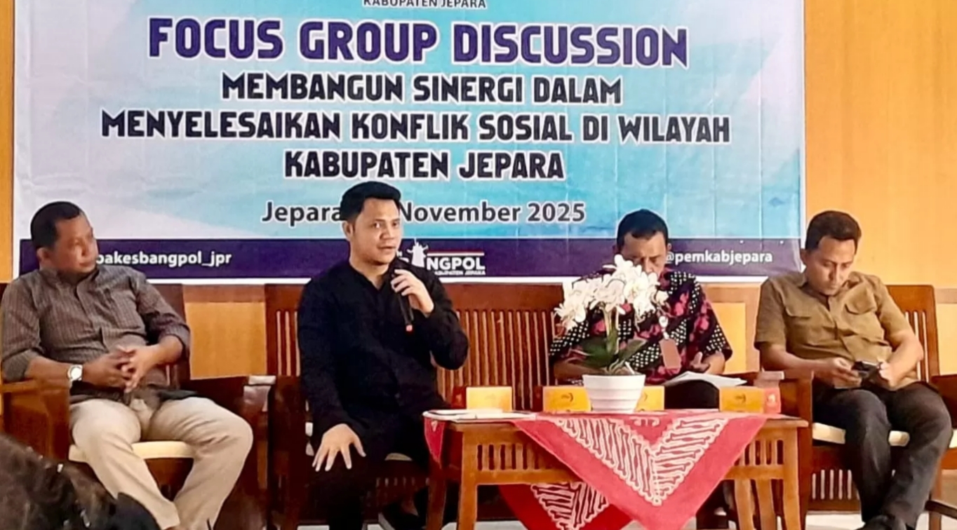 Jepara – Ketegangan sosial yang kian dinamis di Kabupaten Jepara mendorong Badan Kesatuan Bangsa dan Politik (Bakesbangpol) Jepara menggelar Focus Group Discussion (FGD) bertema “Membangun Sinergi dalam Menyelesaikan Konflik Sosial di Wilayah Kabupaten Jepara”, Jumat (28/11/2025), di Aula Bakesbangpol, Jalan Boto Putih.