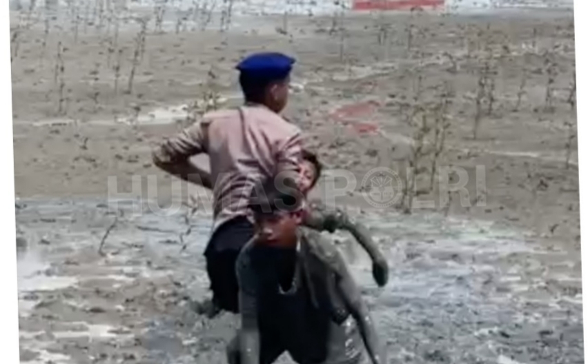 Beruntung, personel Direktorat Polisi Perairan dan Udara (Dit Polairud) Polda Jawa Timur yang tengah melaksanakan pengamanan di lokasi segera merespons cepat. Tanpa menunggu lama, Bharada Nevan, staf Renmin Dit Polairud Polda Jatim, dengan sigap turun langsung ke area berlumpur untuk mengevakuasi kedua anak tersebut.