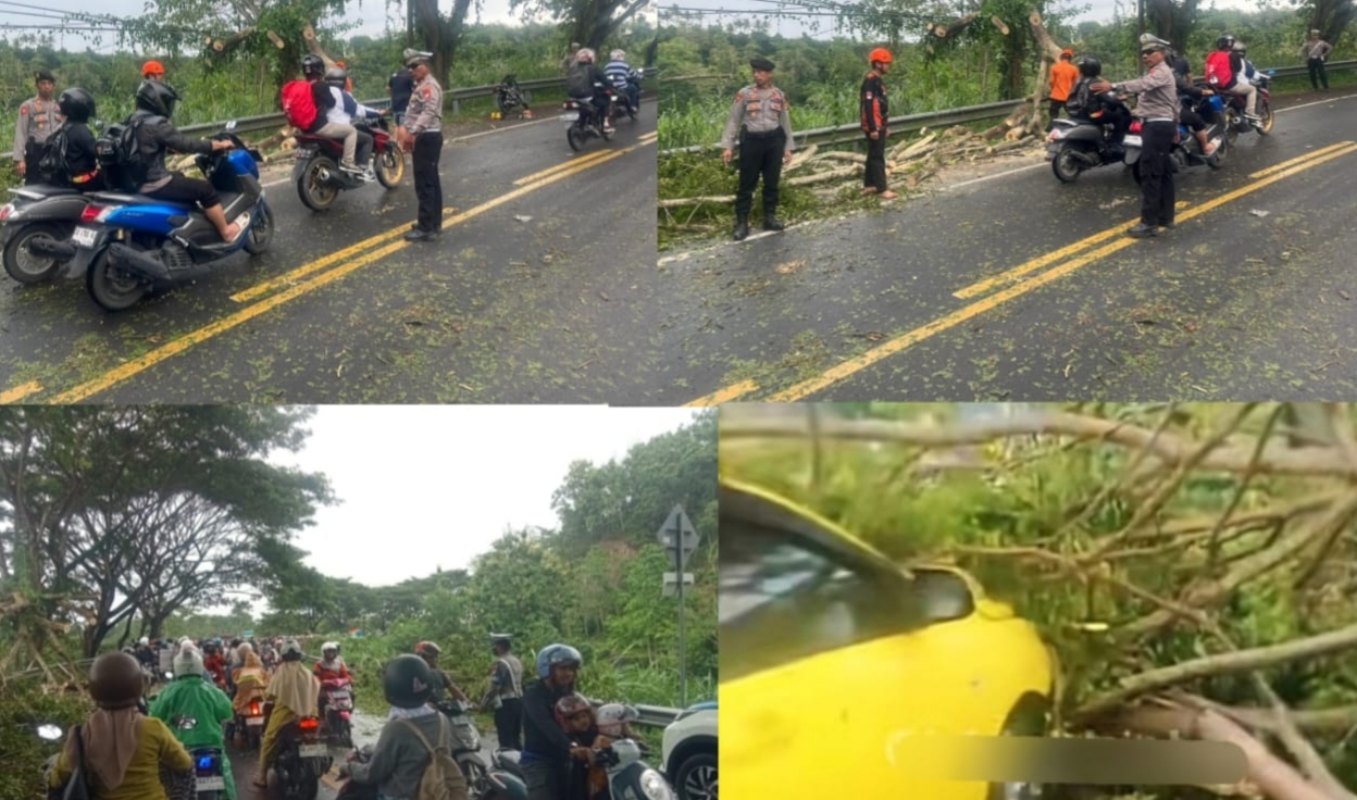 Akibat angin kencang, beberapa pohon tumbang dan menutup badan jalan sehingga menyebabkan kemacetan panjang dari kedua arah.