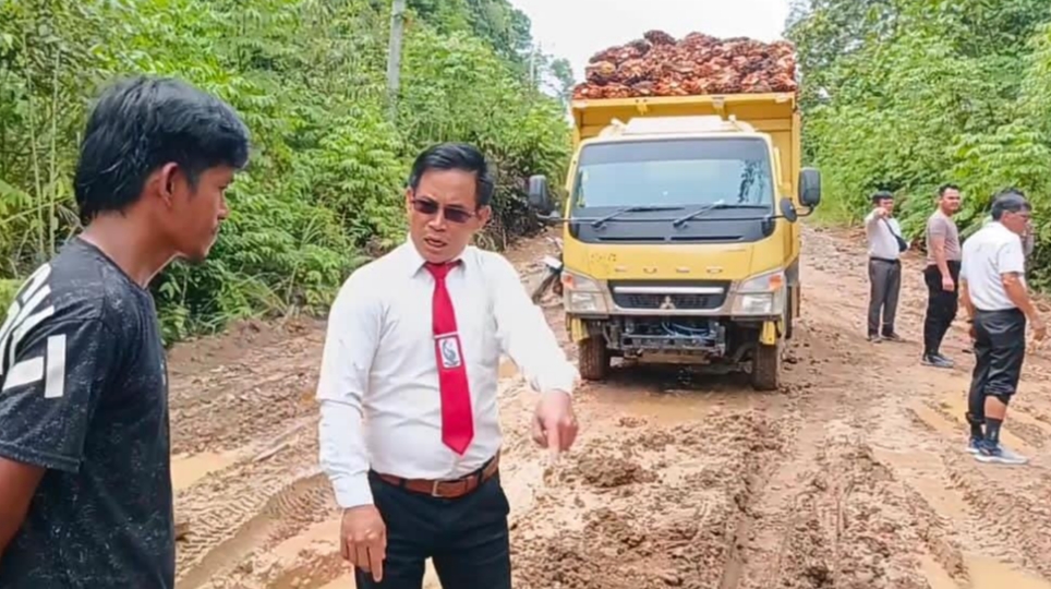 Sebuah video yang beredar luas memperlihatkan Sukarman, S.H., pengacara sekaligus tokoh masyarakat setempat, menghentikan langsung sebuah truk pengangkut kelapa sawit yang tetap nekat melintas di jalan tanah yang telah berubah menjadi lumpur parah usai diguyur hujan.