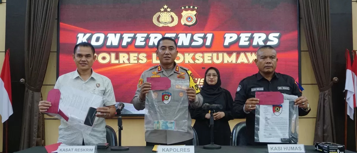 Penetapan tersangka diumumkan langsung oleh Kapolres Lhokseumawe AKBP Dr. Ahzan saat konferensi pers di Gedung Serbaguna Polres Lhokseumawe, Kamis siang (5/2/2026), didampingi Kasat Reskrim Dr. Bustani dan Kasi Humas Salman Alfarasi.