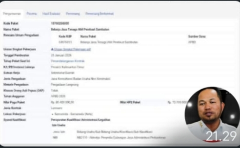 Berdasarkan tangkapan layar yang beredar, paket tersebut disebut sebagai belanja jasa tenaga ahli pembuat sambutan dengan sumber dana APBD. Namun, kebenaran dokumen dan rincian ruang lingkup pekerjaan yang dimaksud belum dapat dipastikan secara independen.